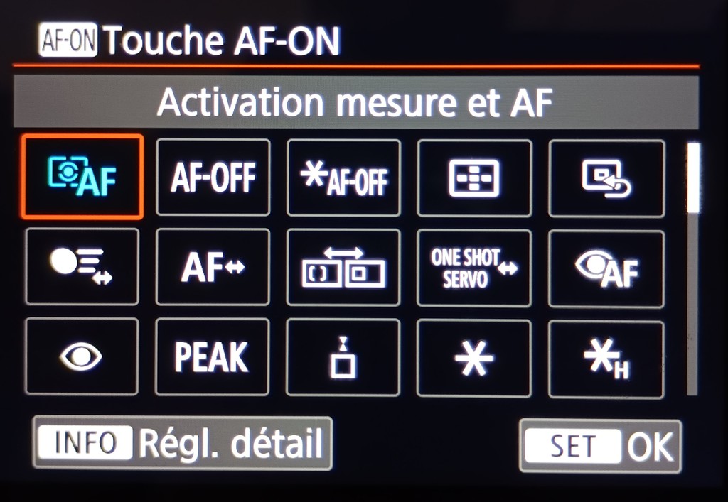 Quand vous appuyez sur ce bouton AF-ON, l’appareil fait le point, et; quand vous le relachez, il arrête de chercher à faire la mise au point. C’est là tout l’intêret !