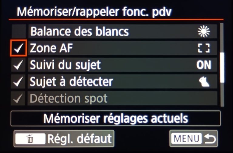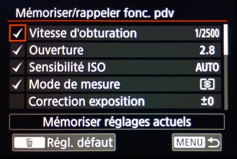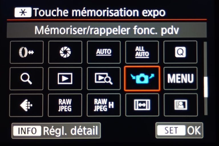 Vous sélectionnez l’étoile, et parmi tous les choix, il faudra aller chercher “Mémoriser/rappeler fonc. Pdv”, avec son icône en appareil photo. Vous entrez dedans en appuyant sur le bouton “info” ou en appuyant directement sur l’écran tactile.